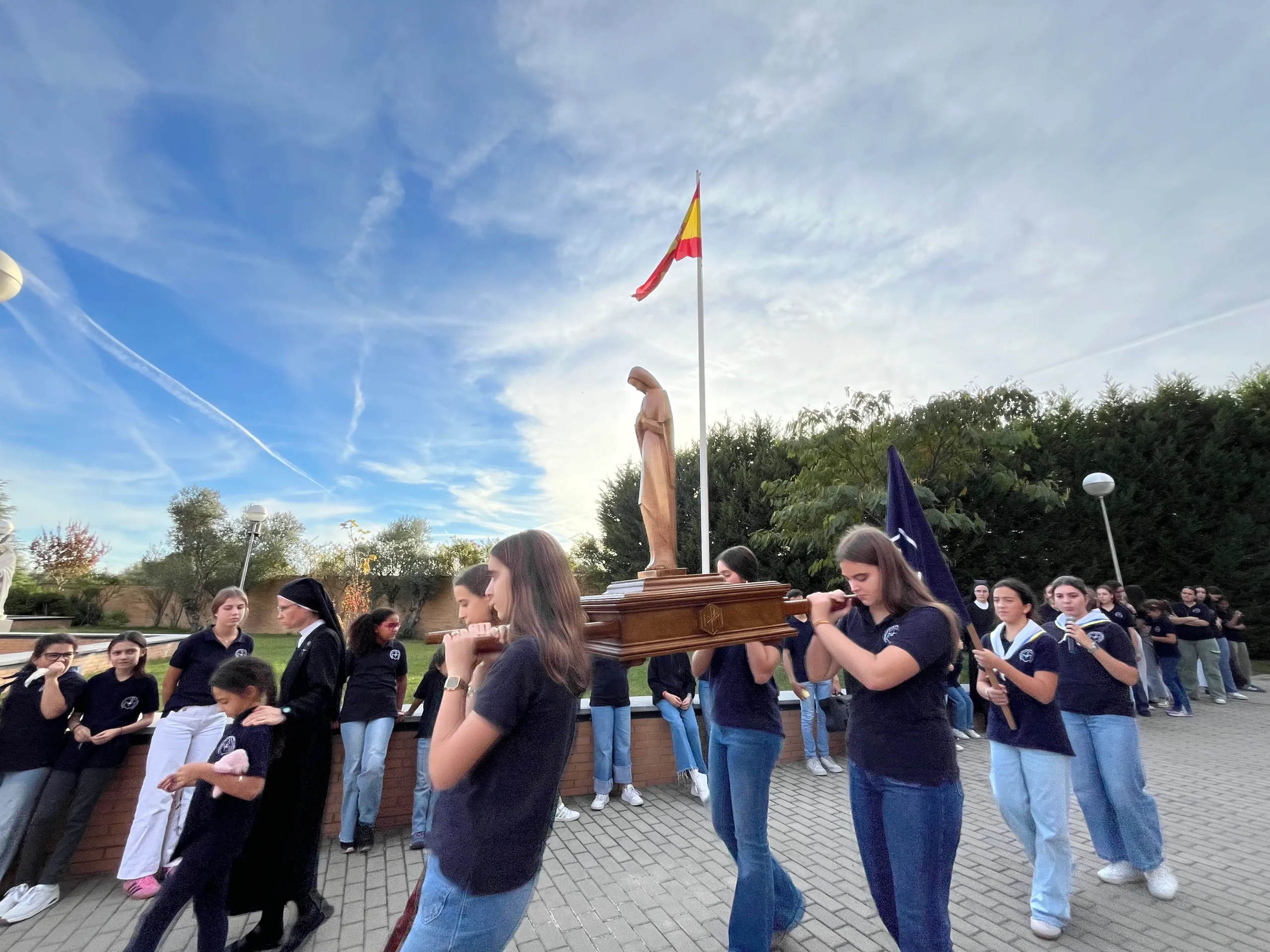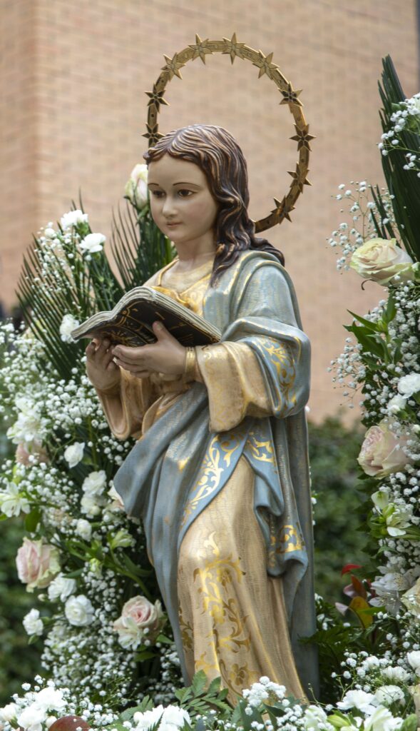 A las 10:30h dio comienzo la solemne procesión con la talla de la Virgen Niña portada por las alumnas de 2º de Bachillerato. Es, sin duda, el momento más esperado del año por las alumnas, profesores, personal, familias, antiguas alumnas, sacerdotes y amigos todos del Colegio. Un momento de Cielo y ocasión privilegiada de presentar a la Virgen tantas cosas que llevamos en el secreto del corazón.
