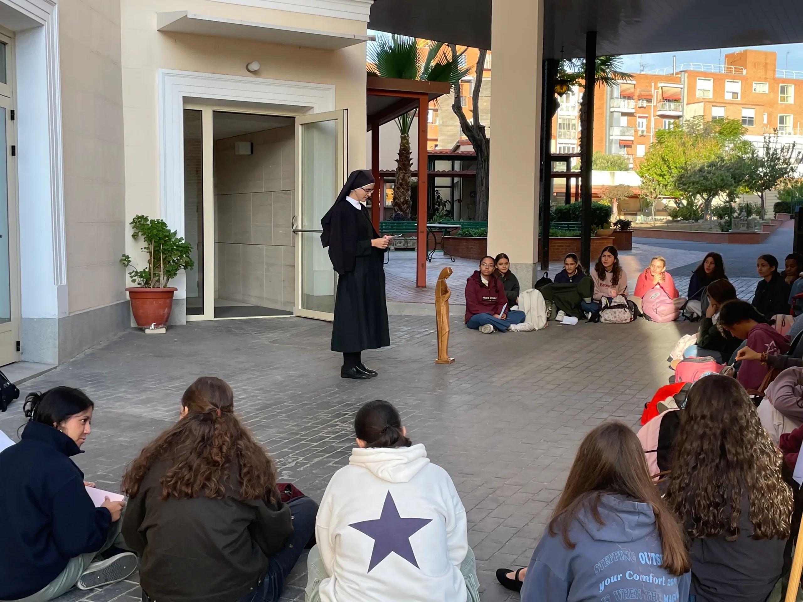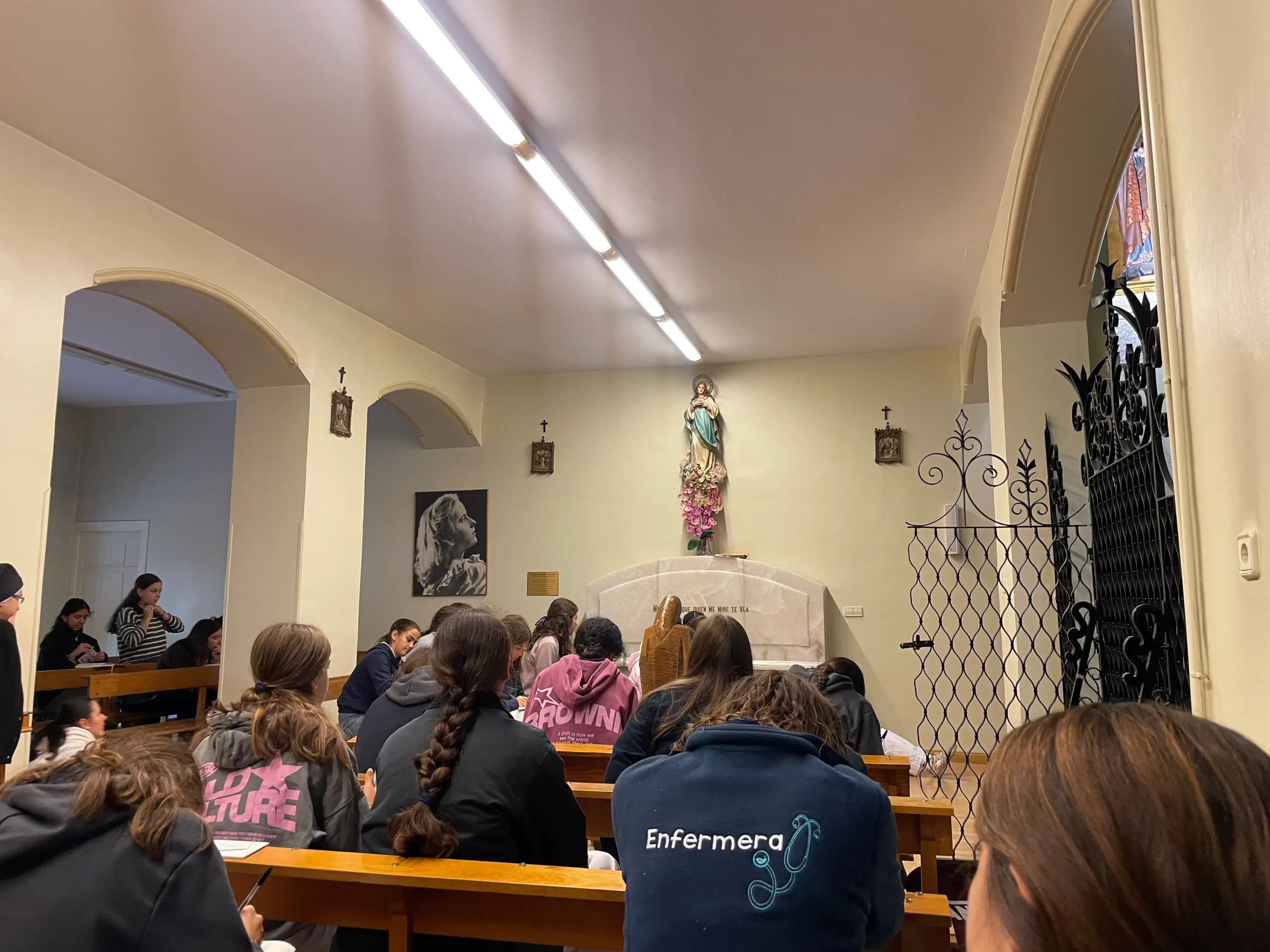 Aunque estaba prevista una marcha a la montaña, la previsión de lluvia motivó un cambio de planes. Por la mañana nos desplazamos a Carabanchel y visitamos el museo y el sepulcro de Teresita González-Quevedo, una congregante madrileña que vivió entre 1930 y 1950 y se tomó muy en serio la llamada a la santidad. Su lema era: Madre, que quien me mire te vea.