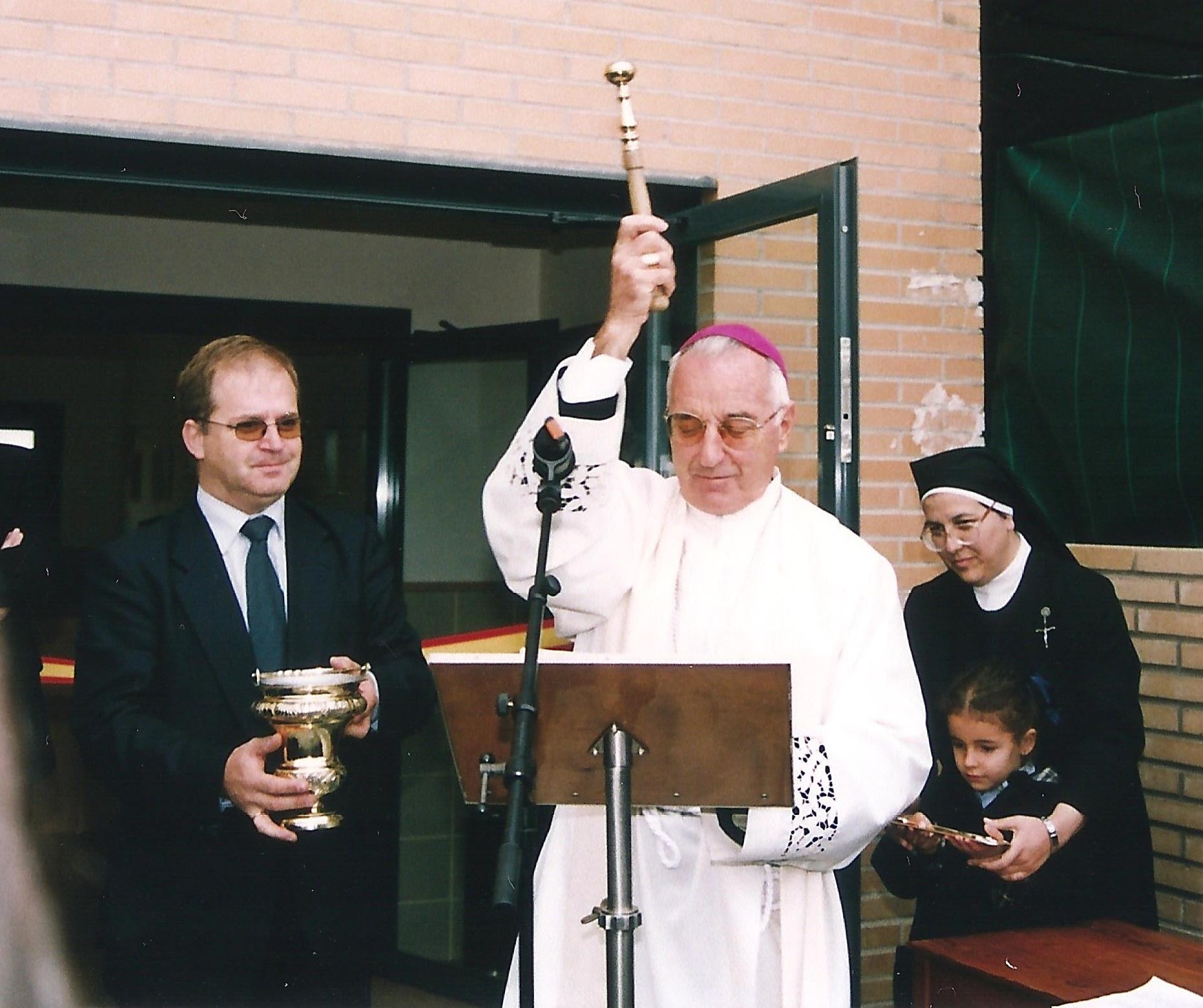 A las 12 empezó la ceremonia de bendición, presidida por el Sr. Obispo de Getafe, D. Francisco José Pérez y Fernández- Golfín, que se ganó a todo el mundo por su sencillez, por su excepcional talante pastoral y por su sintonía con las niñas pequeñas. Asistieron varios concejales del Ayuntamiento de Valdemoro, varios directores de colegios públicos y numerosos sacerdotes (más de 20), que después concelebraron en la Santa Misa de acción de gracias en la Parroquia de la Asunción, la principal del pueblo.